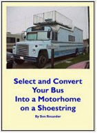 Select and Convert Your Bus into a Motorhome on a Shoestring by Ben Rosander is an easy to read primer for anyone contemplating this rewarding project. This 100 Page book includes over 175 photos, drawings and basic plans and will help the reader see what has been and can be done in a bus conversion. While the primarily focus is on economical school bus conversions, this book also includes information applicable to larger highway coaches. Loaded with practical tips and both the positive and negative aspects on conversions, this book is a must read for both the novice and experienced converter.